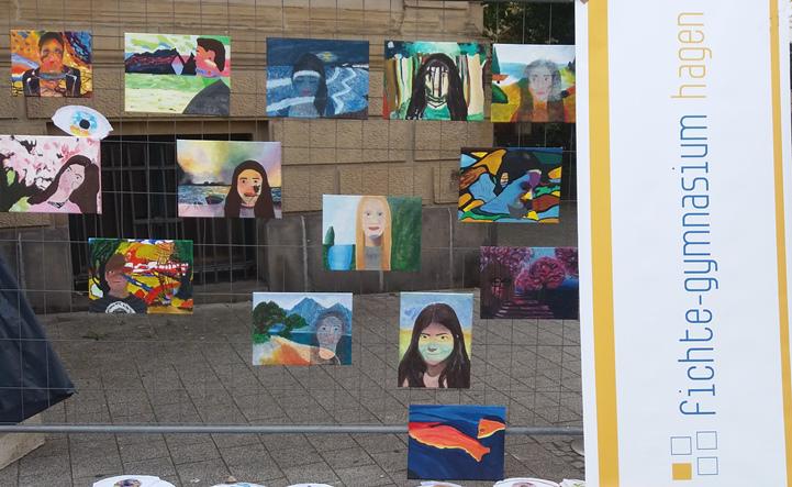 ,,Farbe im Blick“ – so lautete das Motto des diesjährigen Kunstfests. Farben im Blick hatten dabei die Schülerinnen und Schüler der Klasse 6c und der Jahrgangsstufe Q1, deren farbenfrohe Arbeiten im Kunstquartier Hagen präsentiert wurden. Zu bestaunen gab es Bilder von bemalten Händen, die sich auf berühmten Kunstwerken tarnen, Zeichnungen von Augen, die auf die Besucher blicken, sowie Selbstporträts überdeckt von Landschaftsmotiven.