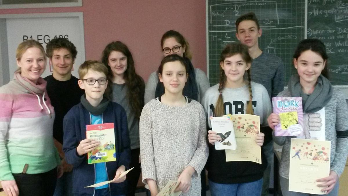 Aufgeregt warteten die vier Vorlesesieger der 6. Klassen auf den Beginn des Schulentscheids des bundesweiten Vorlesewettbewerbs, der von der Stiftung des Deutschen Buchhandels veranstaltet wird. Nur zwei Minuten hatten die vier Schüler Zeit, um mit ihrem vorbereiteten Lesevortrag die Jury von ihrem Lieblingsbuch, ihrer Lesetechnik und ihrer Interpretation zu überzeugen. In der 2. Runde mussten alle Schüler aus dem ihnen unbekannten Buch „Klassensprecher für alle Fälle“ von Sissi Flegel vorlesen. Die Jury, die aus Deutschlehrerinnen und vier Oberstufenschülern bestand, erfuhren etwas über „Krabbat“ von Rebecca Flüshöh. Jana Kopejkina las aus „Dork diaries. Nikkis (nicht ganz so fabelhafte Welt)“ und auch Samira Kransniqi las aus einem Band von „Dork diaries“ vor. In die Geheimnisse eines Schülers Magnus entführte Luis Ahring das ausgesuchte Publikum.