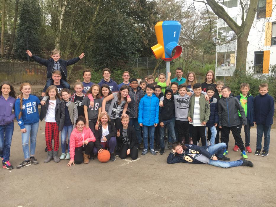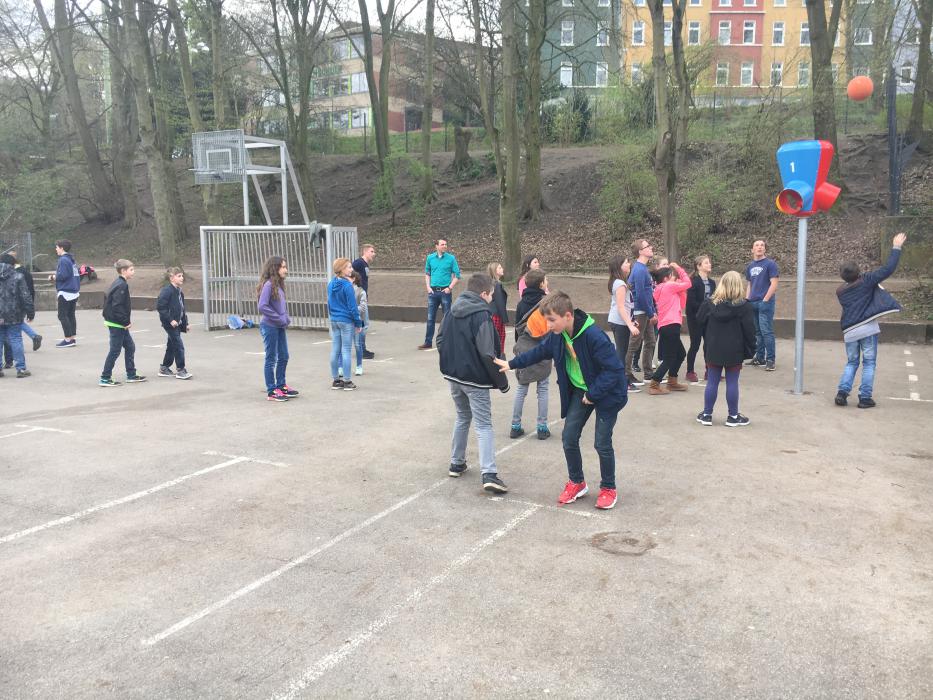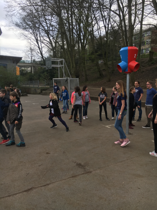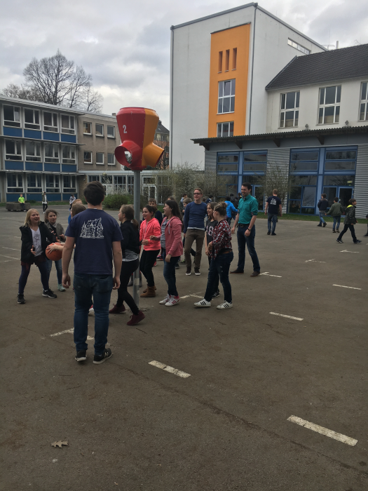 1,2,3,… SURPRISE!!! Kaum war die neue Korbwurfanlage auf dem hinteren Teil des Schulgeländes montiert, flogen auch schon die ersten Bälle dort hinein. Die Überraschung dabei ist, dass man nicht weiß, aus welcher der drei Öffnungen der Ball wieder herauskommt. Somit ist nicht nur Wurfgeschick, sondern auch Reaktionsvermögen bei den Schülerinnen und Schülern gefragt.