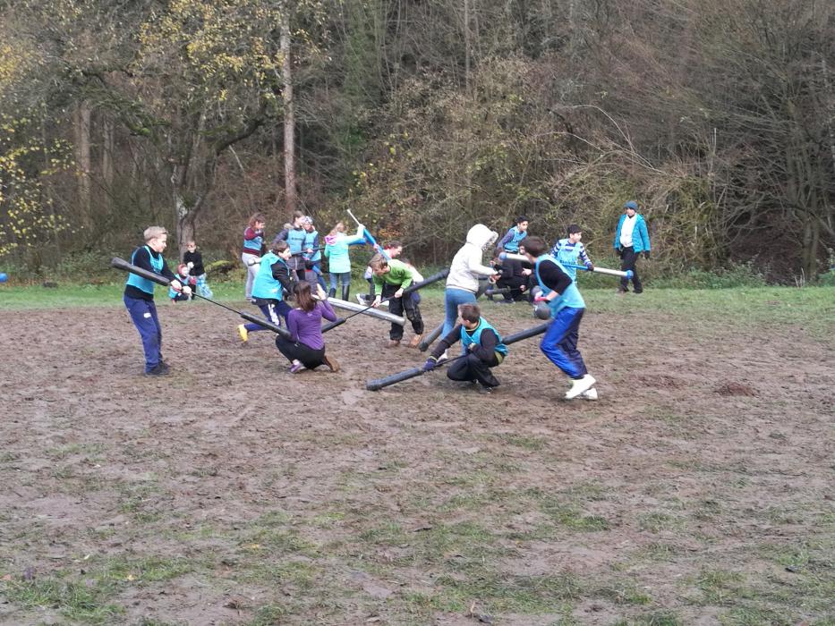 Dann gingen wir in den Wald und spielten das Spiel „ Last man/Last Woman“. In diesem Spiel ging es darum, die anderen Mitschüler mit den Pompfen abzutreffen. Dies wurde so lange gemacht, bis nur noch Zehn übrig waren. Die, die abgetroffen waren, bildeten mit den Pompfen einen Kreis, in dem die übrig gebliebenen Zehn weiterspielten, bis nur noch einer übrig war. Da wir nach diesem Spiel alle nass und hungrig waren,  gönnten wir uns erst mal eine Pause.