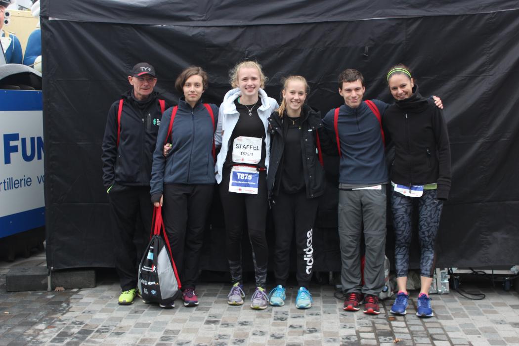 In einer Vierer-Schülerstaffel wagten sich die Fichte-Schüler Malin Saure, Jonathan Zimmer, Annika Dombrowski und Katharine Ullrich an die gigantische Distanz von 42,195 km. Der Startschuss für die erste Staffelteilnehmerin Malin fiel auf dem Otto-Platz in Köln-Deutz unter tosendem Applaus, stimmungsvoller Musik und buntem Konfettiregen. Nach einer stolzen Zeit von nur 1:02 h für ca. 12 km, die zu einem großen Teil entlang des Rheinufers führten, übergab Malin in der Wechselzone am Chlodwigplatz den Staffelchip an Jonathan, dem nächsten Staffelläufer. Fortan führte die Marathonstrecke sternförmig durch die Kölner Innenstadt an etlichen Stimmungshöhepunkten vorbei. Die folgenden 11 km bis zum zweiten Wechselpunkt am Aachener Weiher meisterte Jonathan in einer sehr guten Zeit von 1:03 h.