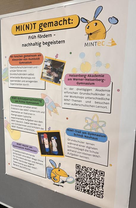 Neben den Workshops bot das Programm Keynote-Speeches, u.a. zu den PISA-Ergebnissen im Fach Mathematik, einen Bildungsmarkt mit diversen Ausstellern (Universitäten etc.) sowie einen Netzwerk-Austausch, wo z.B. die unterschiedlichen MINT-EC-Cluster ihre Arbeitsergebnisse präsentieren. Hierbei stellte Frau Thißen zusammen mit weiteren Cluster-Mitgliedern aus Köln, Paderborn und Hattingen das Themencluster „MI(N)T gemacht! Früh fördern, nachhaltig begeistern“ vor. Auch das Themencluster „Gesundheit“, in dem Frau Flamme mitwirkt, war vertreten.