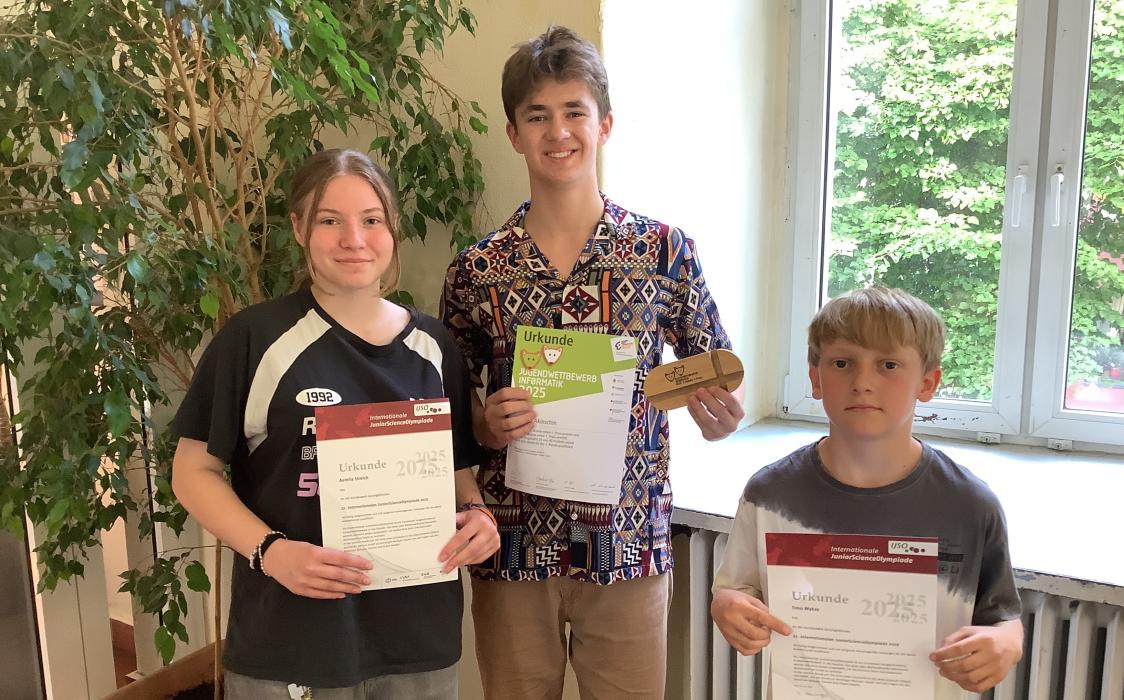 5 Schülerinnen und Schüler haben für ihre erfolgreiche Teilnahme an der JuniorScienceOlympiade oder dem Jugendwettbewerb Informatik Urkunden und Preise erhalten.