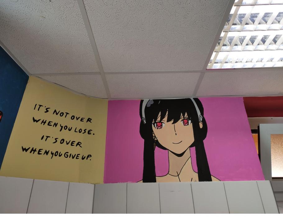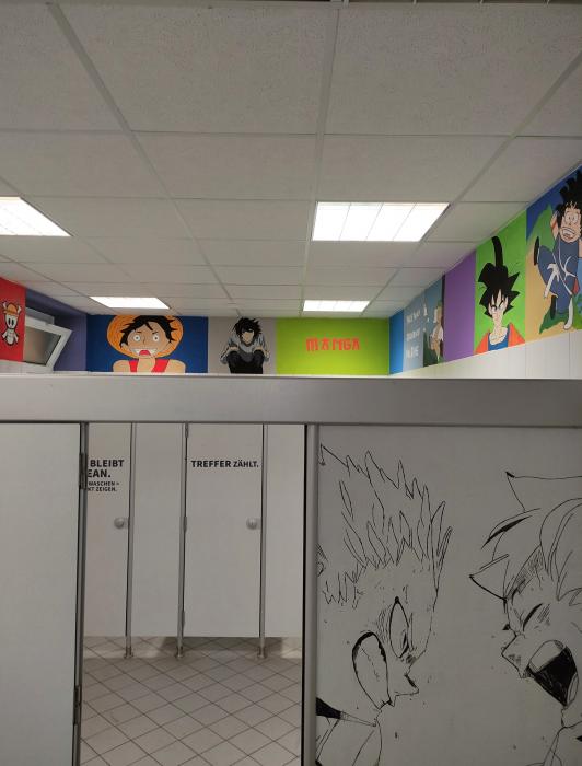 Durch den kreativen Einsatz von Farbe, Spray und unterschiedlichen künstlerischen Techniken sind mit viel Engagement eindrucksvolle Wandgestaltungen entstanden. Die Mädchentoilette wurde unter dem Motto „Märchenwald“ gestaltet, während die Jungentoilette im Stil von „Manga“ farbenfroh und ausdrucksstark umgesetzt wurde.