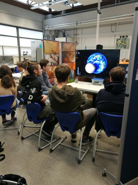 Und auch dieses Jahr durften die Physik-Kurse der EF unter der Leitung von Frau Lücking und Herrn Winkler das Schülerlabor besuchen. Die Organisatoren bereiteten fünf große Stationen für die Schülergruppen vor. Von einem Experiment über die Schwerelosigkeit bis hin zu „Servicerobotik“ konnten die Lernenden außerdem mit Hilfe einer Virtual Reality-Brille (kurz VR-Brille) die Internationale Raum Station ISS erkunden, mit Robotern eine Mission zum Mars simulieren sowie über regelmäßige Bewegungen von Körpern und Planeten im All erfahren.