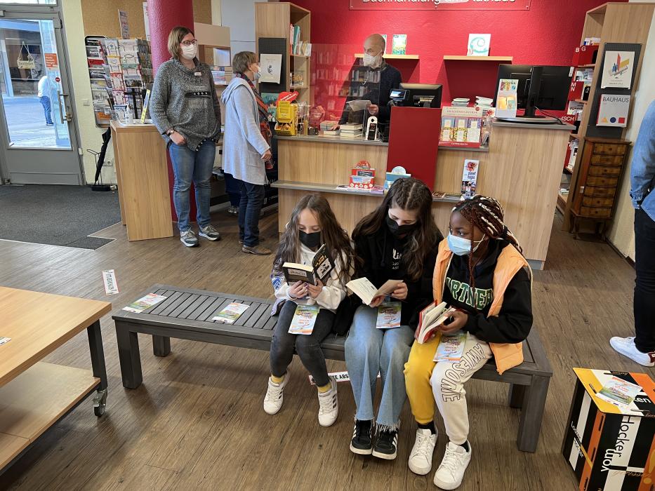 Nach zwei Jahren konnte der Welttag des Buches zum ersten Mal wieder in Präsenz stattfinden und auch die Klassen 5a und 5b nehmen teil und holen sich ihr Buch in der Buchhandlung ab.