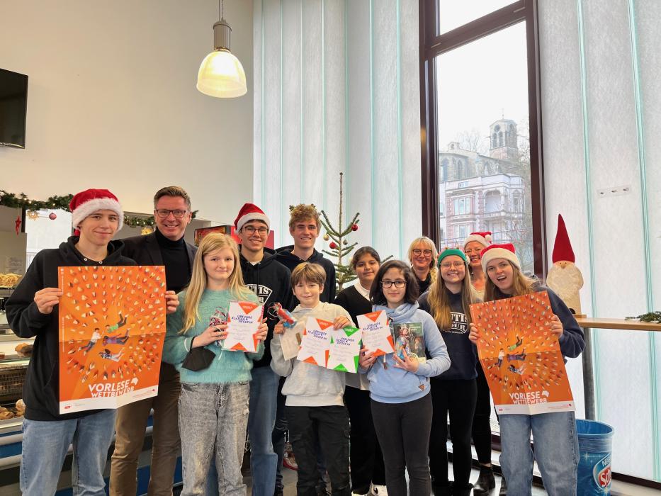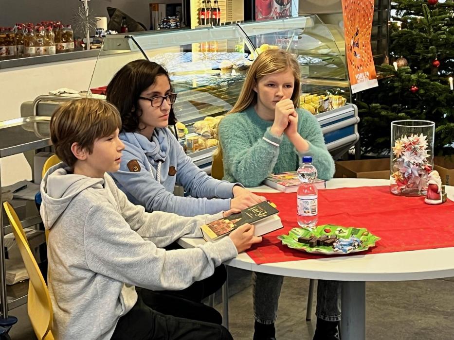 Es gab großen Applaus für die Vorleser, die zunächst einen eigenen Text vortragen durften und im Anschluss einen Fremdtext vorlesen mussten. Benno aus der 6a, Emilia aus der 6b und Talia aus der 6c verführten die Schülerinnen und Schüler und die Jury, die aus Nupelda, einer Schülerin aus der 7c, Frau Schönlau als Elternvertretung, Herrn Fischer als Schulleiter, Tutis und Frau Cegledi (stellvertretend für das Fach Deutsch) bestand, in tolle Bücherwelten. Der Sieger, Benno, las aus seinem Buch „Rory Shy. Der schüchterne Detektiv“ vor und entschied schließlich den Wettbewerb für sich. Nun darf er beim Vorlese-Wettbewerb im nächsten Jahr das Fichte-Gymnasium auf Stadtebene vertreten. Wir sind gespannt und wünschen ihm schon jetzt viel Erfolg!