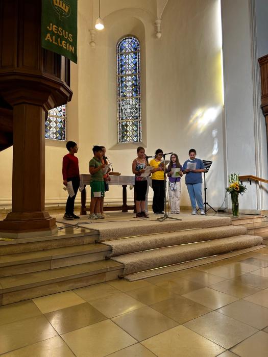 Nach einer sehr stimmungsvollen und in den Farben des Regenbogens gestalteten Feier in der ev.-ref. Kirche am Bergischen Ring, in der es vor allem um das Thema „Miteinander“ ging, führte der Weg für die neuen Schülerinnen und Schüler zunächst in den Gemeindesaal und anschließend in die langersehnte erste Stunde an der neuen Schule! Die Eltern hatten währenddessen Gelegenheit miteinander ins Gespräch zu kommen und erste Eindrücke und Erfahrungen auszutauschen.