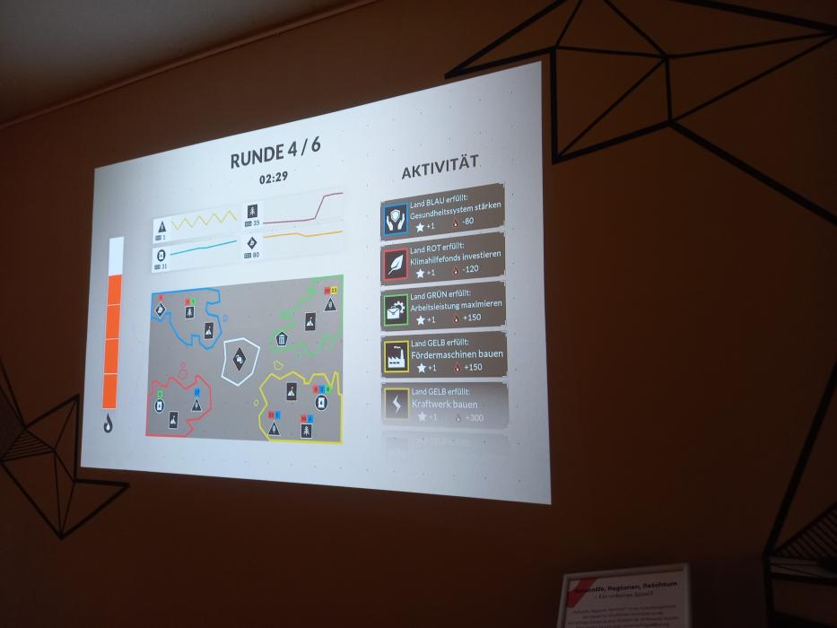 Nach einem eindrucksvollen Besuch im Bergwerk nahmen wir an einem interaktiven Planspiel rund um das Thema ,,Rohstoffe, Regionen und Reichtum“ teil. In dem Spiel wurde unsere Gruppe in jeweils vier kleine Gruppen aufgeteilt, wobei jede Person ein Handy bekam. Es ging darum, uns Schülerinnen und Schülern den Eindruck des globalen Handels mit Erdöl, Holz, Getreide, Gold und Müll hautnah zu vermitteln. In den vier Regionen mit fünf Rohstoffen war das Ziel, möglichst viel Wohlstand für die eigene Region zu sammeln. Allerdings waren die Startbedingungen alles andere als fair, denn manche Länder hatten Goldvorkommen, andere gemischte Ressourcen und eines galt als Müllhalde. Nach jeder Runde entschied die Gruppe über gemeinsame Ereignisse und Konsequenzen: Wem gehören neue Rohstoffe? Wieviel Hilfe bekommt ein Land bei einer Katastrophe?