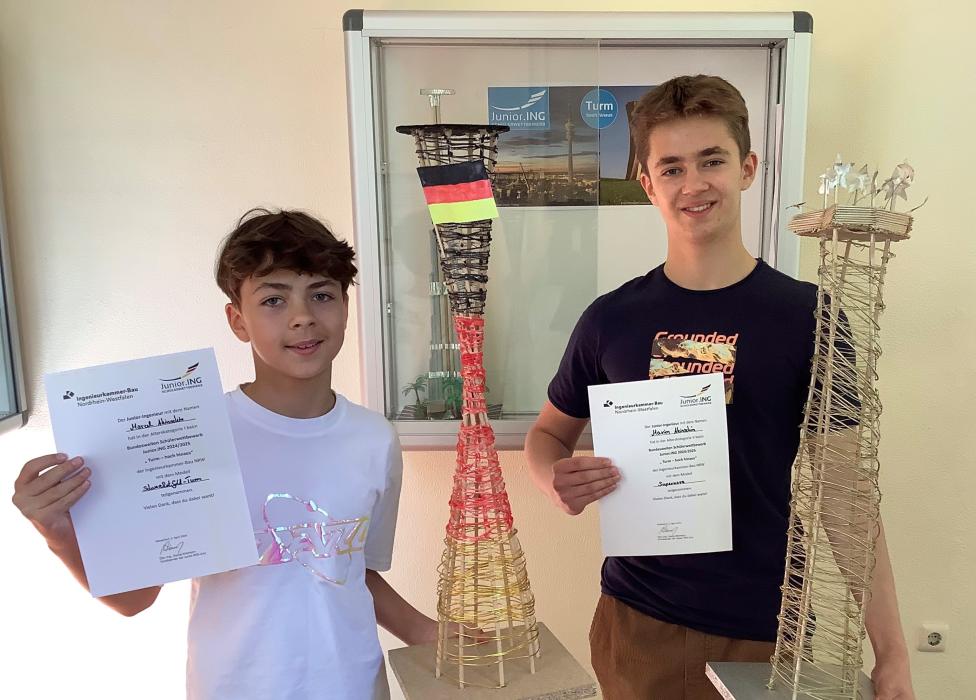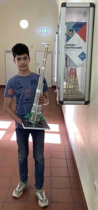 Unter dem Wettbewerbsthema „Turm - hoch hinaus“ traten drei Schüler unserer Schule mit Einzelbeiträgen an: Marcel Akinschin (6a) gestaltete einen Turm aus Draht und Holzstäben in Sanduhrform mit dem Titel „SchwarzRotGold-Turm“, Abdulaziz Edelby (6b) reichte das Turmmodell „Burj Khalifa“ nach dem Vorbild des Wolkenkratzers in Dubai ein und Maxim Akinschin (9a) baute einen Aussichtsturm mit dem Namen „Supernova“.
