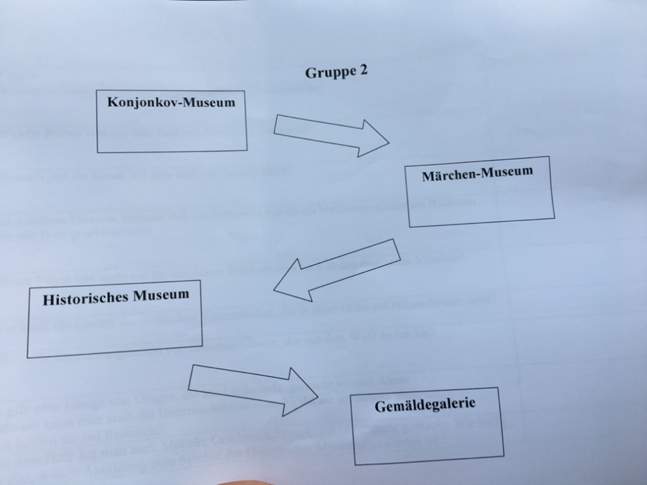 Insgesamt gab es drei Gruppen, die zwar alle das Gleiche machen sollten, jedoch war die Reihenfolge in der die Museen in der folgenden Museumsrallye besucht werden sollten, unterschiedlich. In den einzelnen Museen mussten wir dann Fragen zu den jeweiligen Museen beantworten. In der Gemäldegalerie wurde zum Beispiel gefragt, welche Jahreszeit Zhachowski auf einem seiner Bilder darstellte.