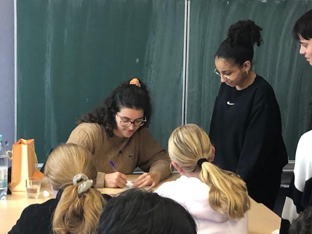 Im Anschluss durften wir Fragen stellen, die sie sehr ehrlich und ausführlich beantwortete. Man merkte, dass ihr der Austausch mit jungen Menschen besonders wichtig ist. Die Autorin sprach offen z.B. darüber, wie das Buch entstand, wie es zu dem Titel kam oder wieviel sie mit ihrem Buch verdient. Gefragt nach der Botschaft, die sie mit ihren Texten vermitteln möchte, meinte sie, dass es sehr wichtig ist, dass man zu sich selbst steht. Dies ist für jemanden, der zwischen zwei Kulturen aufwächst manchmal besonders schwierig.